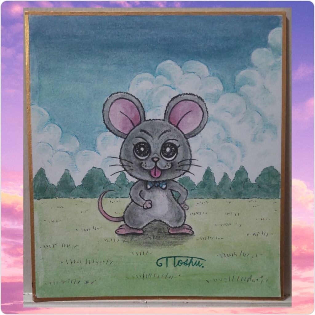 1/4サイズ色紙に手描きした、干支のねずみ
